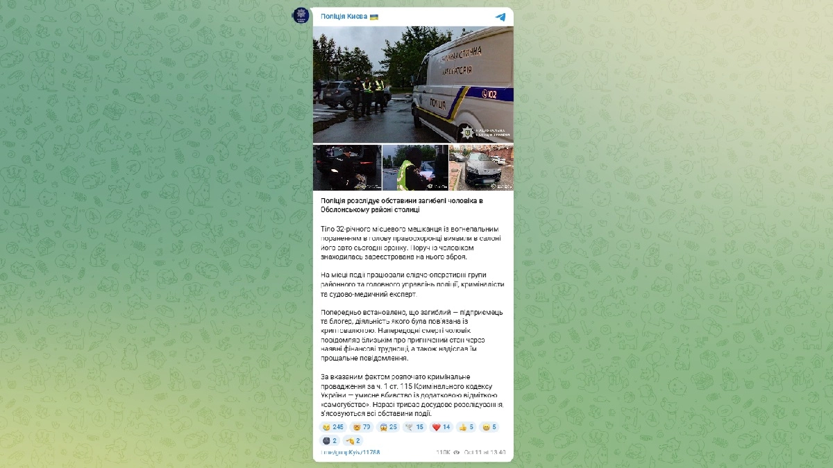 The Kyiv Police Department initiated criminal proceedings under Part 1 of Article 115 of the Criminal Code of Ukraine as a case of intentional murder, with an additional note of "suicide." The police confirmed that a pre-trial investigation is ongoing and that all circumstances of the incident are being clarified.