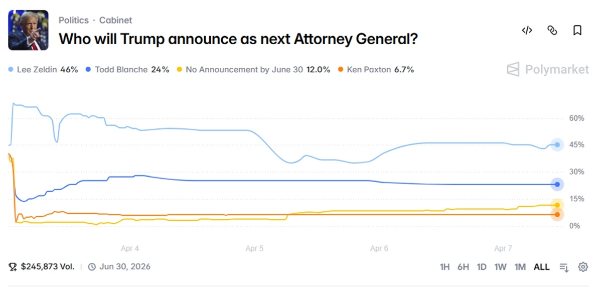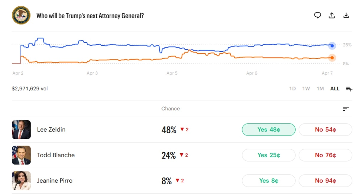 On Kalshi, the "Next Attorney General" contract shows Zeldin with a commanding lead, reflecting a high probability among traders that the former New York Congressman will be shifted from the EPA to the DOJ. Similarly, Polymarket participants have heavily backed Zeldin, with his "shares" trading significantly higher than other potential candidates.